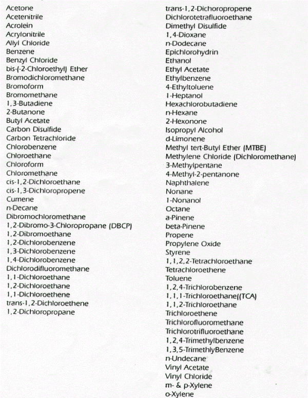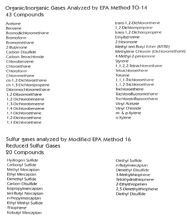 Sources and Pollutants Air Pollution Monitoring There are many different kinds of air pollution but air pollutants can be characterized in two ways - as Particulate Matter PM & Gases: Particulate Matter: PM10, PM2.5, dust, heavy metals, lead, soot, other solids PM can come from incinerator stacks, power plants, road traffic, construction, and many other sources. It is usually referred to by the largest particle's diameter. So PM10 refers to particulate matter smaller than 10 microns in diameter (a micron = 10-6 m = 1 millionth of a meter). Mechanically generated dust particles are generally larger and don't stay in the air too long. Particles that come from combustion sources are smaller so they tend to stay in the air longer and are worse for your health because they can settle into your lungs. There are currently national air quality standards for PM 10. New national standards for PM2.5 are being developed. Gases: ammonia, chlorine, ozone (smog), NOx, CO2, sulfur gases, VOC's such as benzene, toluene etc. Many air pollutants are not in solid form like PM but instead are found in gaseous form. These gases may react with sunlight and other gases in the air to form ground level ozone, or smog (not to be confused with ozone in the upper atmosphere which protects the earth from harmful UV rays). VOC stands for Volatile Organic Compounds. Organic refers to the presence of carbon in the molecule. Chemicals present in gasoline are VOC's because they are molecules of carbon and hydrogen atoms combined with other elements. Volatile refers to the fact that this chemical will change quickly from liquid to gas. That is why you see vapor recovery equipment on the gas pumps; it's to capture the liquid gasoline that has become gas and would normally escape into the air while you are pumping. Health effects of gaseous pollutants differ greatly. Many can cause breathing difficulties, some cause cancer and reproductive harm, some can cause harm to your nervous or immune system. The cumulative health effects from exposure to multiple VOC's have not been adequately studied and are poorly understood. Organic/Inorganic Gases analyzed by EPA modified method TO-14, 81 Compounds Organic/Inorganic Gases analyzed by EPA method TO-14, 43 Compounds Sulfur Gases analyzed by modified EPA method 16 reduced sulfur gases, 20 Compounds please note: on some browsers you may be able to enlarge the image by resting your mouse on the lower right corner of the image and clicking source: Communities for a Better Environment The Bucket Brigade Manual To order send a check for $15 payable to: Communities for a Better Environment Attn: Bucket Brigade 1611 Telegraph Ave, Suite 450 Oakland, CA 94612 Phone: (510) 302-0430
